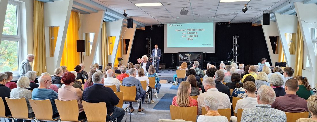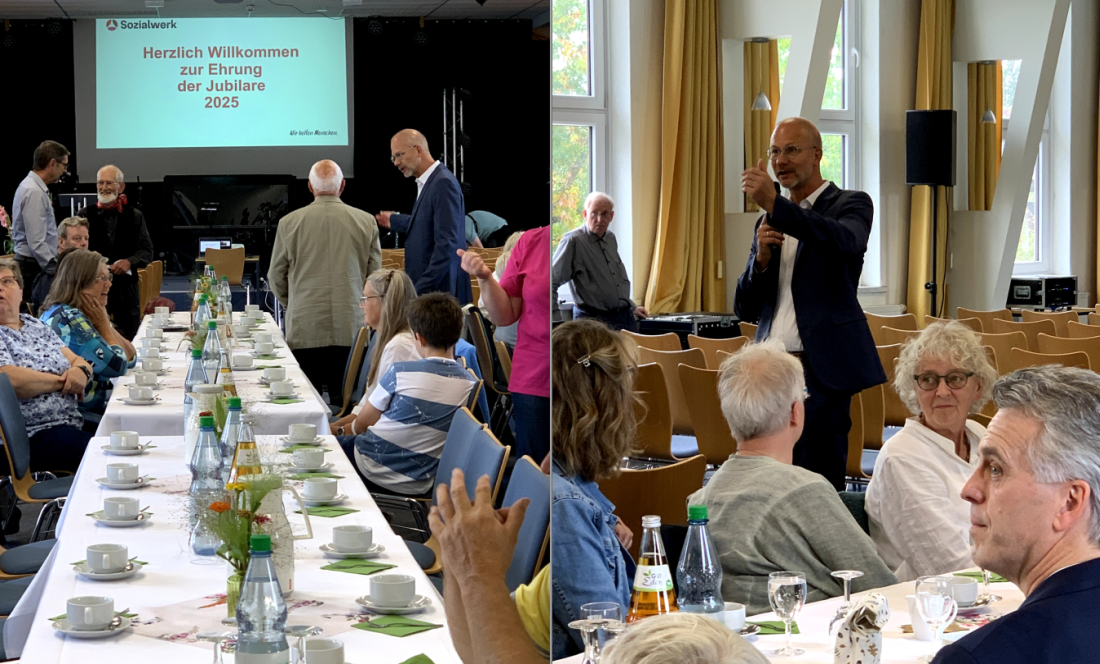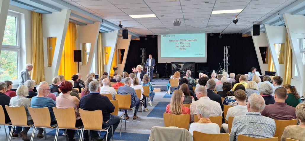 Im Gröpelinger Kaminsaal saß geballte Berufserfahrung, als im September 50 langjährig Mitarbeitende im Sozialwerk (einschließlich Menschenskinners!), von denen rund die Hälfte anwesend war, gewürdigt wurden. Die Jubilarinnen und Jubilare kamen in Begleitung von Angehörigen, Gästen, Kolleginnen und Kollegen, manche schon im Ruhestand, sodass der Kaminsaal mit etwa 70 Personen gut besucht war. Bei Kaffee und Kuchen ließ es sich entspannt miteinander an der festlich von der Hauswirtschaft gedeckten Tafel ins Gespräch kommen.
