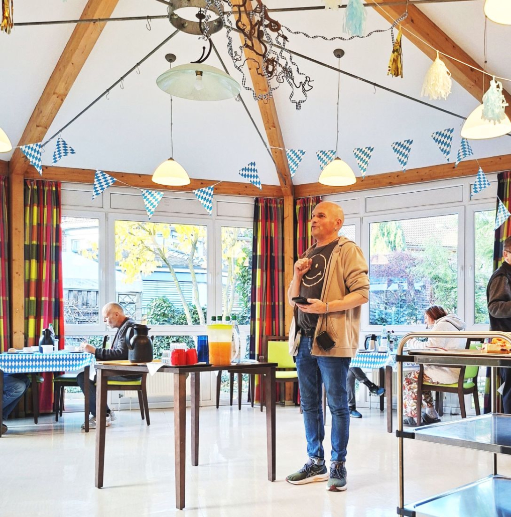 Schlager aus vergangenen Jahrzehnten weckten Erinnerungen, gute Stimmung lag in der Luft des gemütlichen Speisesaals mit Rundumblick ins Grüne. Grüppchen fanden sich, man half sich gegenseitig beim Setzen, Stühlerücken und Kaffeeeinschenken, und vom Team war auch immer jemand zur Stelle, wenn mal was danebenging oder Kuchennachschub gefragt war. Jeder und jede wird hier gesehen und je nach ihren Bedürfnissen und Fähigkeiten unterstützt und begleitet.