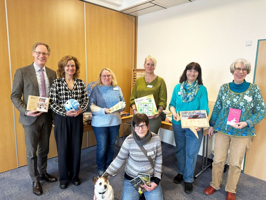 Im Februar besuchte eine Delegation die Heimstätte Ohlenhof, neugierig, wie die gesponserten Medien in der Praxis ankommen. Einrichtungsleiterin Vera Strech und die Beschäftigungskräfte ihres Teams, Monika Drews, Claudia Chibani, Sabrina Schulz und Tanja Voß, hießen die Vorstandsmitglieder des Vereins – Dr. Helga Trüpel und Cornelius Neumann-Redlin – sowie die stellv. Direktorin der Stadtbibliothek Bremen Anika Schmidt und Susanne Kühne mit Lotte herzlich willkommen. Die Gäste sahen und hörten genau zu, wie Mensch und Material aufeinandertrafen. Eindeutiges Ergebnis: Freude über jedes Spiel, jeden Film und jedes Buch.