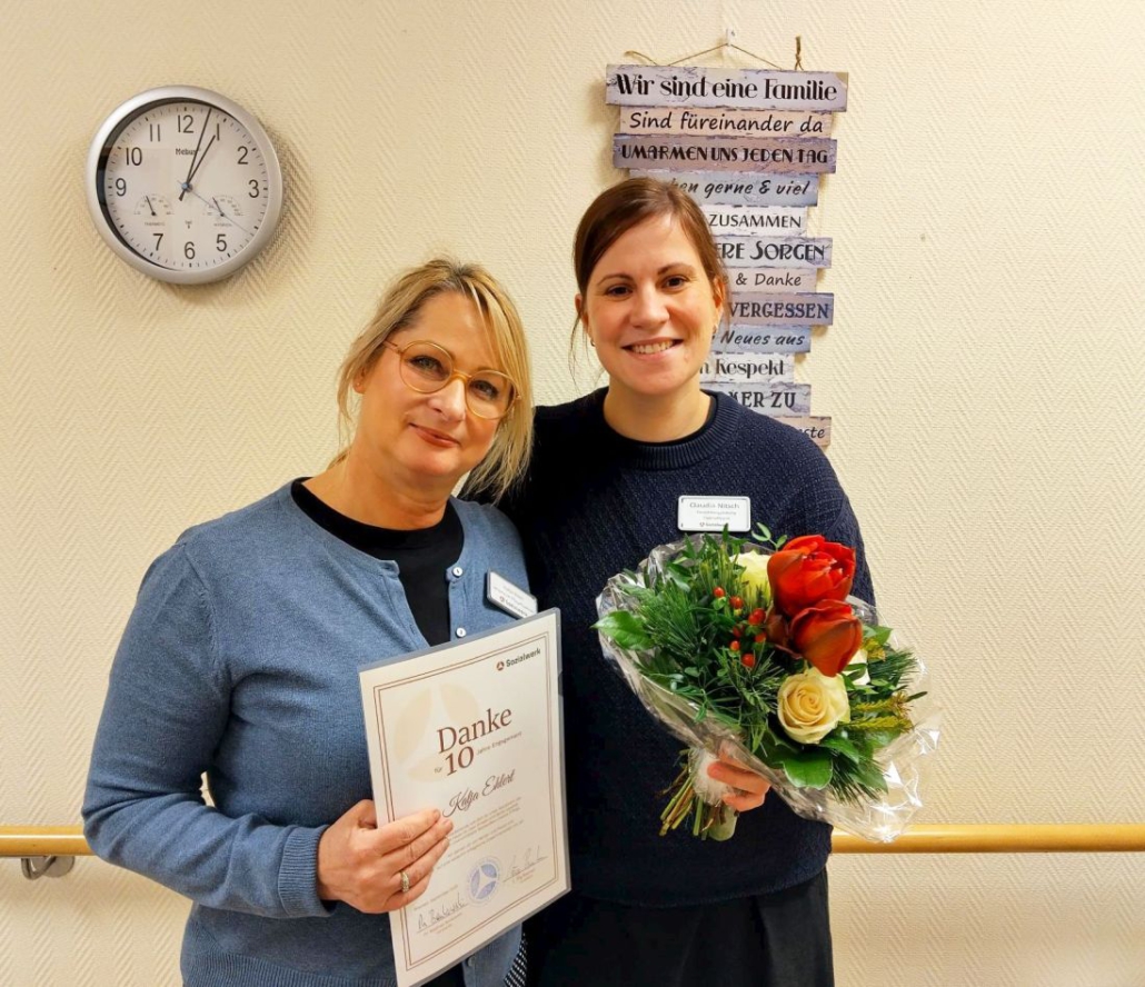 Jubilarin Katja Ehlert und Claudia Nitsch, Leiterin der Tagespflege-Einrichtungen im Sozialwerk